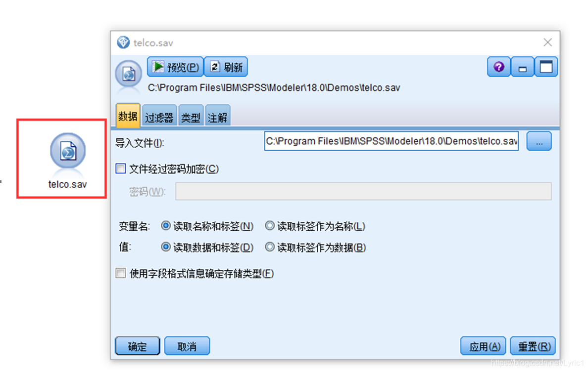 数据的描述性性统计可以使用SPSS Modeler的【数据审核】功能。例:将数据源节点拖入数据流构建区域,双击打开,选择需要进行分析的文件。